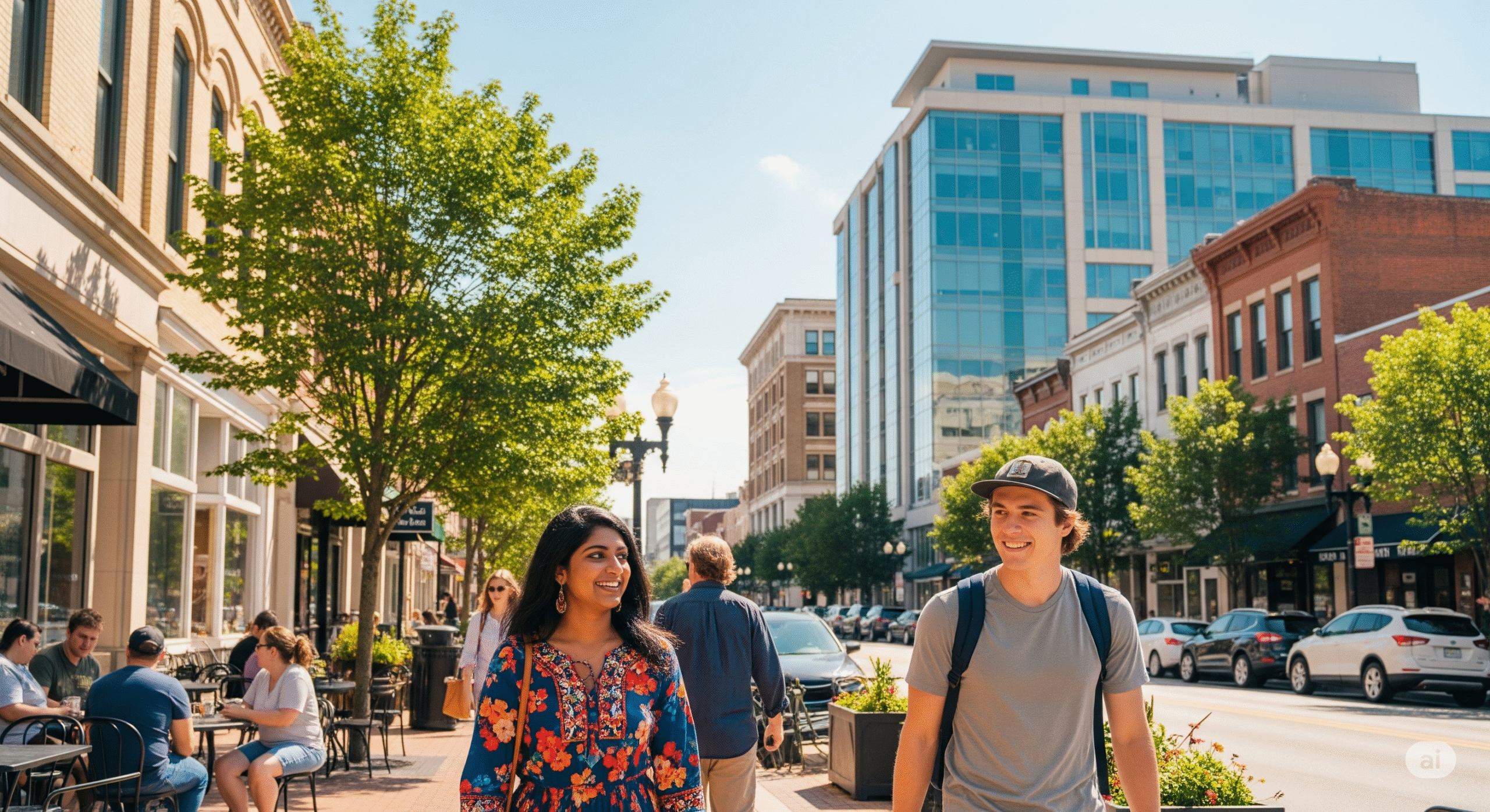 A bright, sunny day on a clean, vibrant main street of a mid-sized American city.…